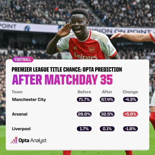 失利或并不影响夺冠,Opta的英超预测阿森纳仍旧遥遥领先